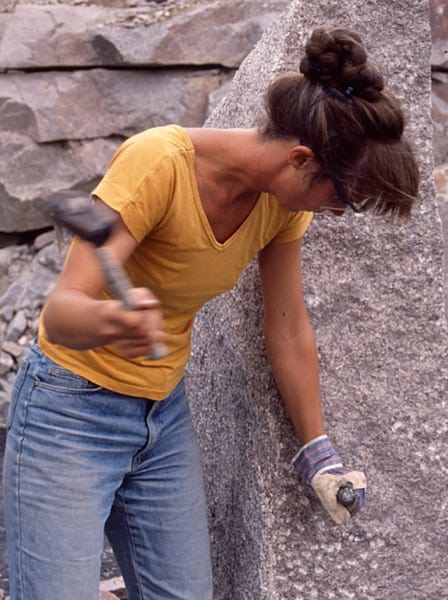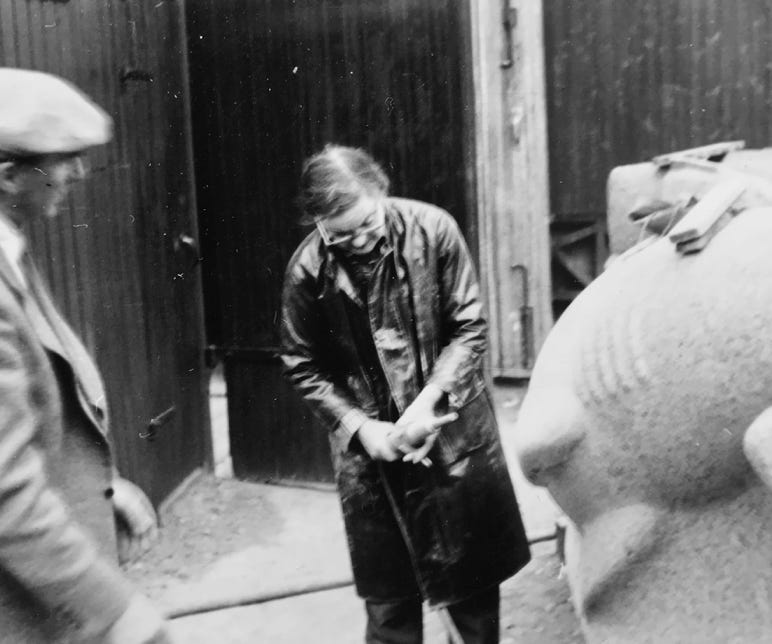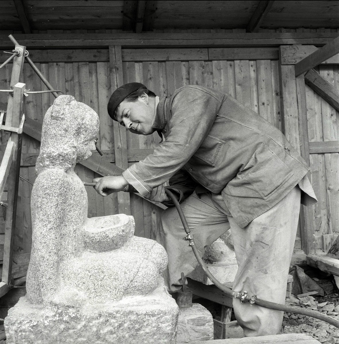 Billedhogger Kåre Orud i arbeid med en av sine skulpturer. Han var aktiv på Steinskulptur AL i mange år.
