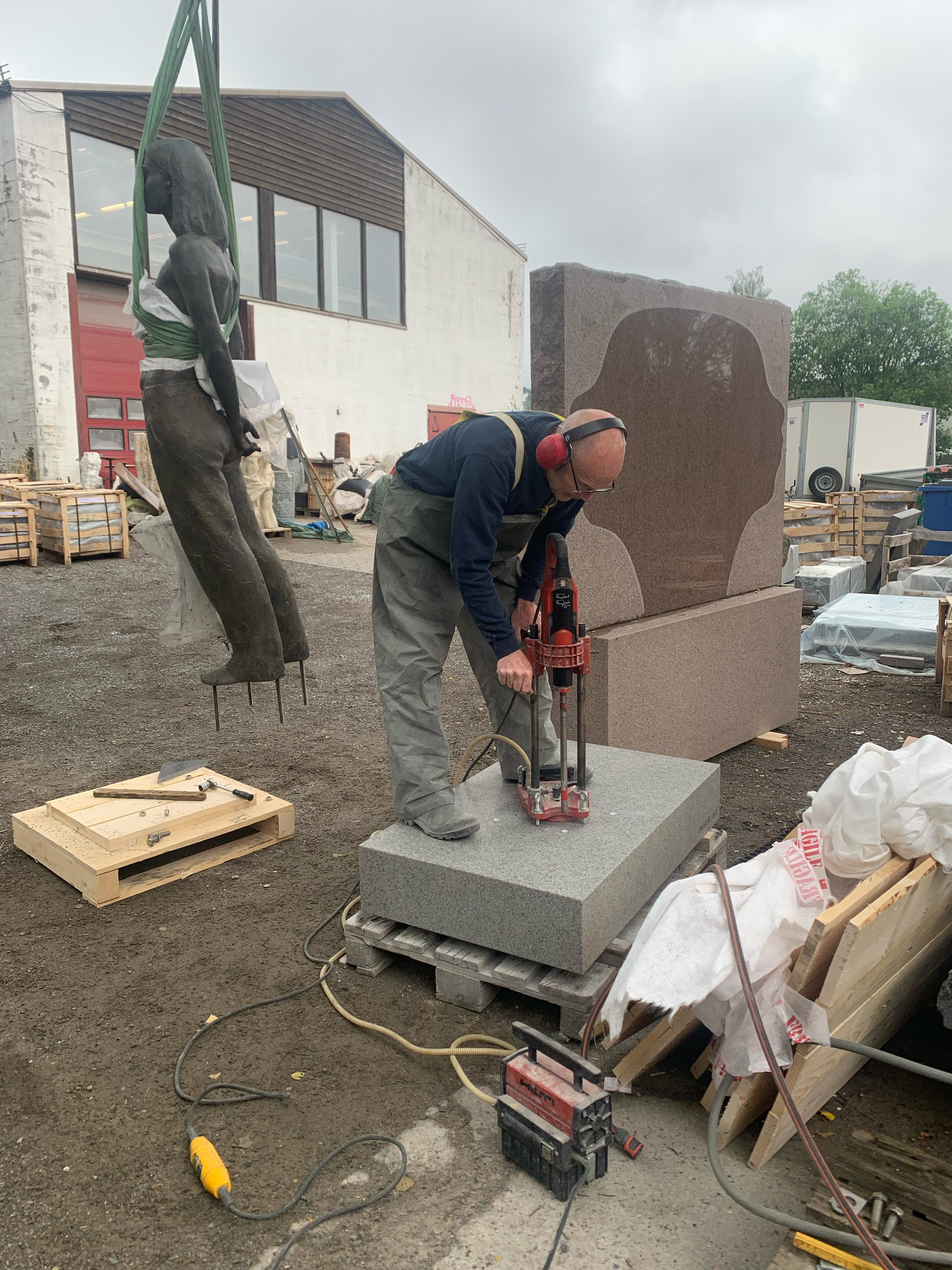 Daglig leder, Kjartan Garvoll, bistår med montering av skulptur på sokkel. «Et portrett av en modig kvinne» av Håkon Anton Fagerås. I bakgrunnen sees granittskulptur av Kjersti Wexelsen Goksøyr. Foto: NBF/ Erik Steen