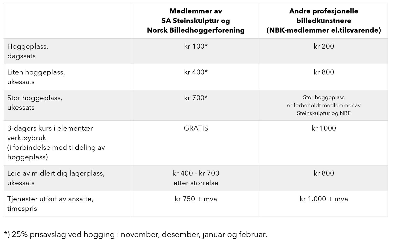 SA STEINSKULPTUR tilbyr alle profesjonelle billedkunstnere gunstige leiepriser. Medlemmer av SA STEINSKULPTUR og medlemmer av Norsk Billedhoggerforening har prisrabatt. Takstene ligger som vedlegg på www.steinskulptur.no og i søknadsskjema.